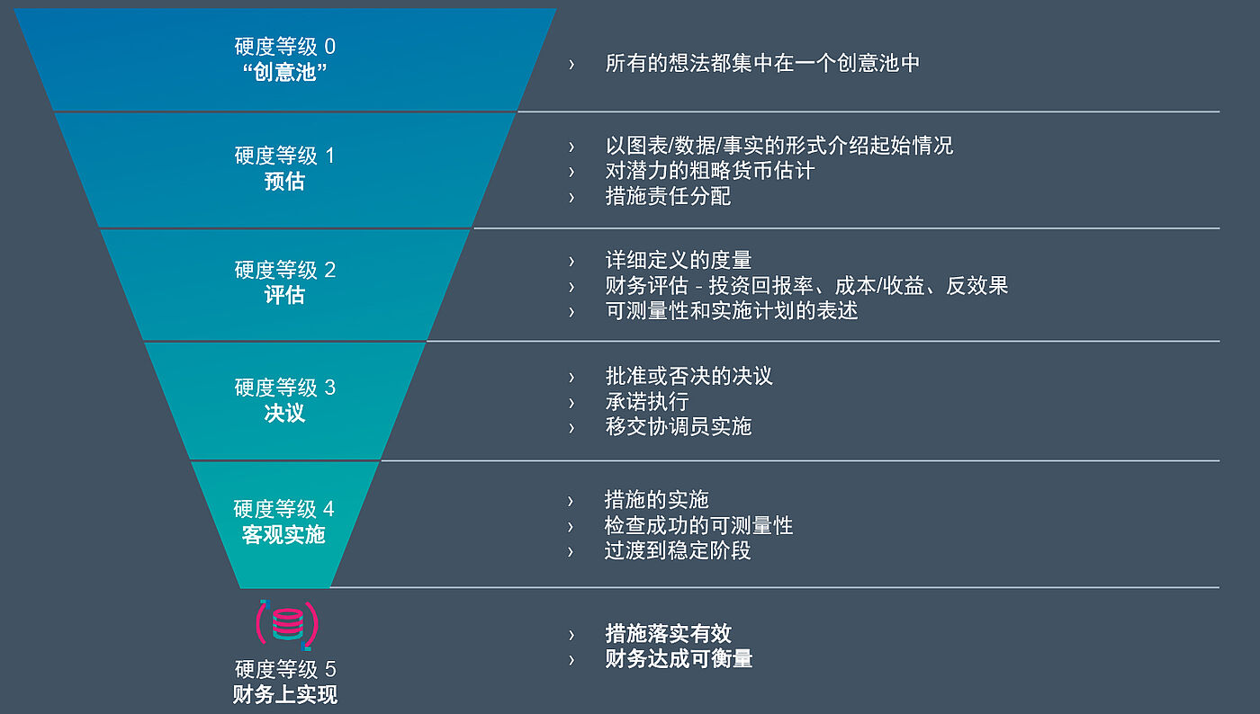 优化过程拥有需实现的具体目标。所有措施通过硬度来评估和控制。当已确定硬度等级5中确认的措施后,一个子项目将视为完成。